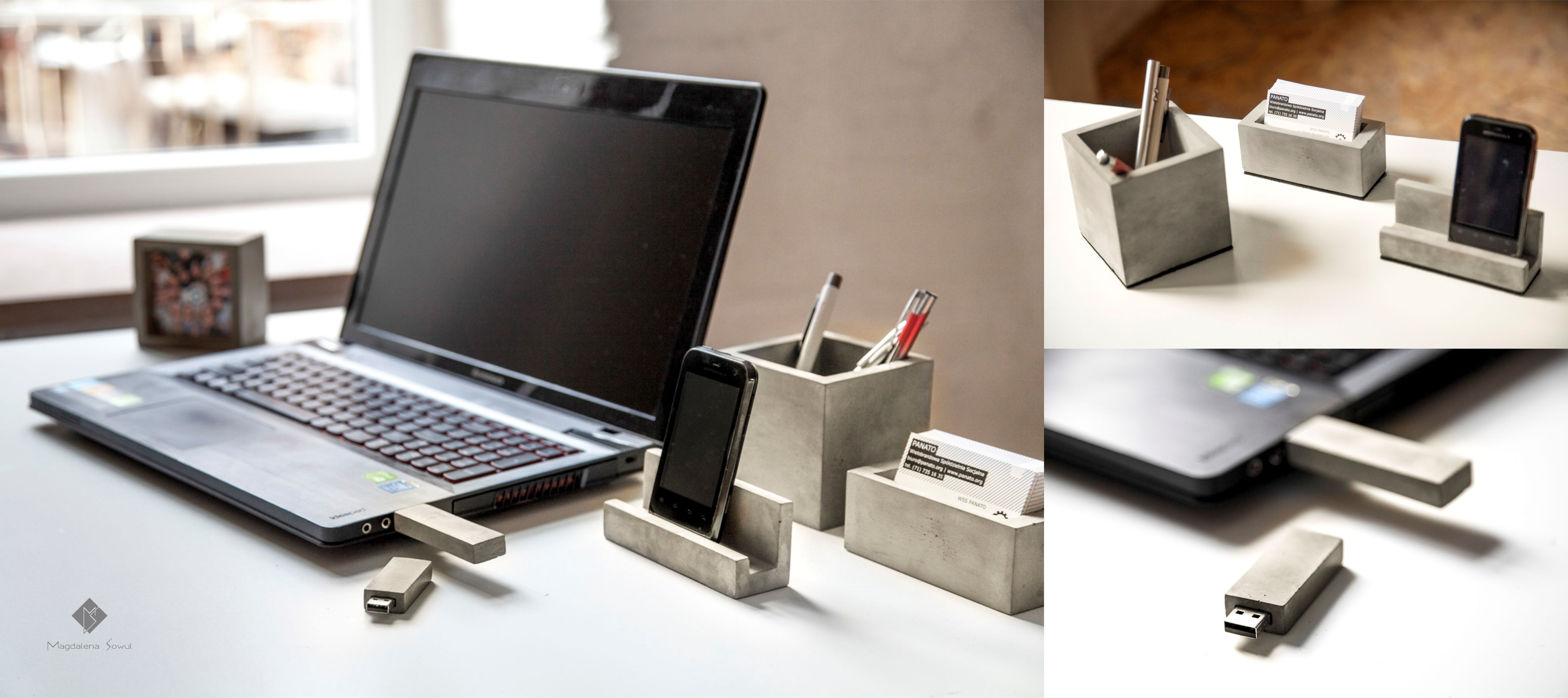 Projekt betonowych akcesorów dla biura i domu; oszczędna forma i surowy materiał. Zakres: projekt i realizacja / Design of concrete accessories for the office and home; straight form and raw material. Submit: project and realisation
